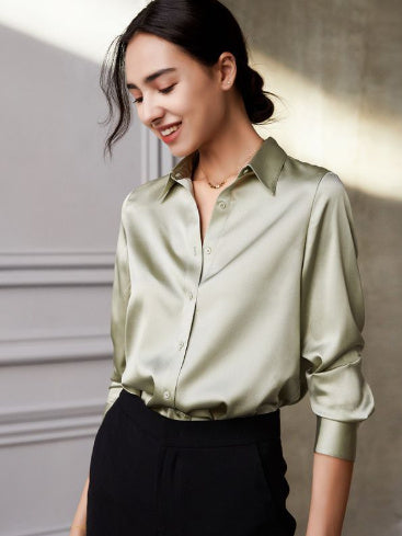 Odette is a refined satin-effect blouse featuring a graceful fake two-piece illusion, POLO-style collar, and structured cuffs. Designed for the modern woman who values effortless sophistication and feminine tailoring.