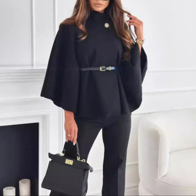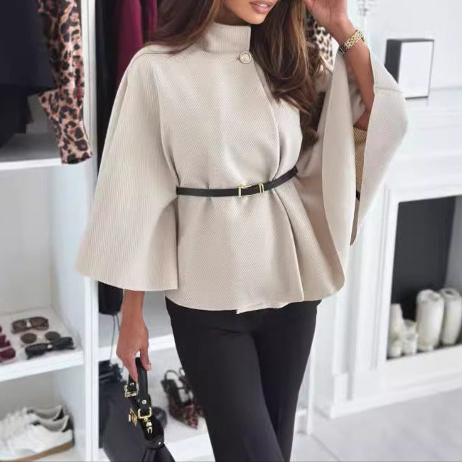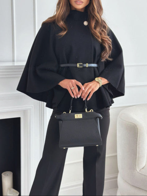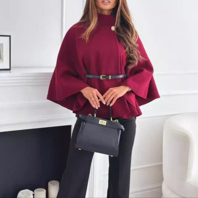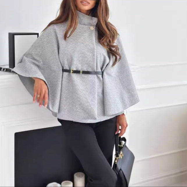 Violette is a modern twist on the classic cape, featuring dramatic batwing sleeves, a sleek stand collar, and a waist-defining belt. Crafted from soft wool-like polyester, it offers both warmth and polish — perfect for the sophisticated woman on the go.
