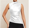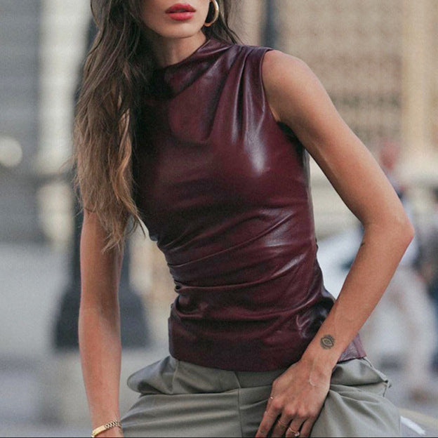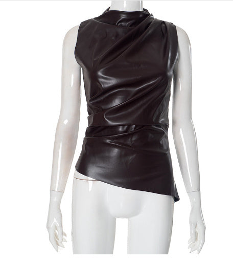 Raymonde is a slim-fit pullover top crafted from PU leather, featuring a cascading collar, asymmetrical waistline, and subtle stitched detailing. Designed to turn heads, it blends street-style attitude with elevated European charm.